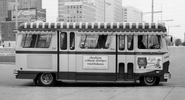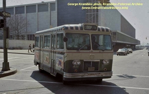 | In this April 2, 1974 photo, DSR Minibus #101 is seen turning from Washington Boulevard onto Larned Street while working the MINI-LOOP #1 route. A smaller size Cobo Hall can be seen in the background — some years prior to its expansion across Larned Street in 1989. [photos courtesy of the Krambles-Peterson archive collection: George Krambles photo] |