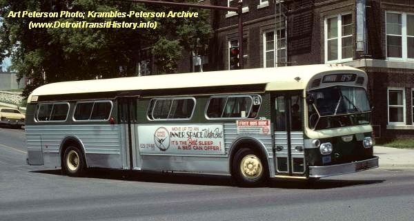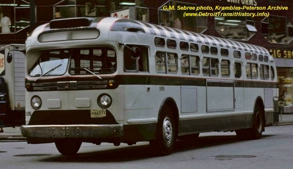 | In 1965, approval was granted to the DSR to order twenty coaches manufactured by the Flxible Co. out of Loudonville, Ohio, for testing on the DSR's heavily traveled Woodward Avenue line. A 105-coach order was split with General Motors and 85 GM TDH-5303s were also ordered. On August 23, 1965, the first of 20 Flxible coaches (#3501-3520) — Model F2D6V-401 — were delivered and placed into trial service along-side the new GM fleet. Unfortunately, shortly after being placed into service, a number of brake related accidents involving the fleet would occur. [website owner's collection photo, courtesy of the Schramm photo collection] |