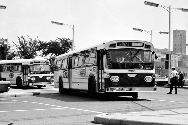 | In this Sept. 2, 1965 photo, coach #3519 participates in a special 20-bus parade of brand new Flxible coaches during their maiden voyage up Woodward Ave. The "short-lived" Flexible fleet would later be replaced by a fleet of 20 GM "New-Looks" (#2501-2520) in November 1966. Because of the numerous brake and transmission problems the buses were returned to Flxible. [Walter P. Reuther Library, Wayne State University photo #48416 — see disclaimer below] |