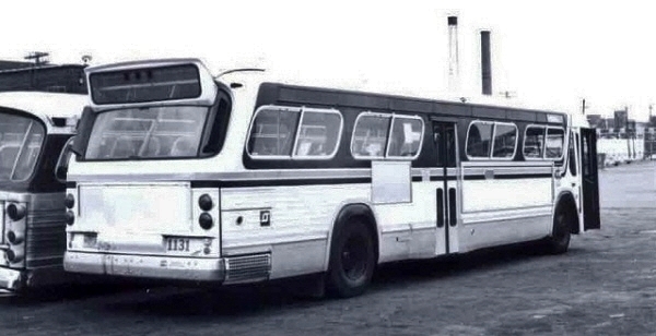 This rear view of coach #1131, parked at the Shoemaker Terminal next to an early-1960s New- Look, shows how the rear of the coach had evolved over 15 years of production, including the addition of Federal required safety lights. Like the #2800-2900 series new-looks that preceded them, these 5307As also came equipped with air-conditioning, along with GM's Environmental Improvement Package (EIP) vertical exhaust system, designed to cut exhaust emissions, odor and smoke. But unlike the V-8s of the previous fleet, these 5307As came with V6-71 engines. [website owner's collection photo, courtesy of the Schramm photo collection] |