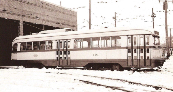 PCC car #101 was one of the first two PCC cars to arrive in Detroit in back in Oct. of 1945. The two cars were first tested on the DSR's heavy Woodward Avenue line before additional cars were ordered. (Photo source: Richard S. Short photo collection—online photos)