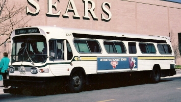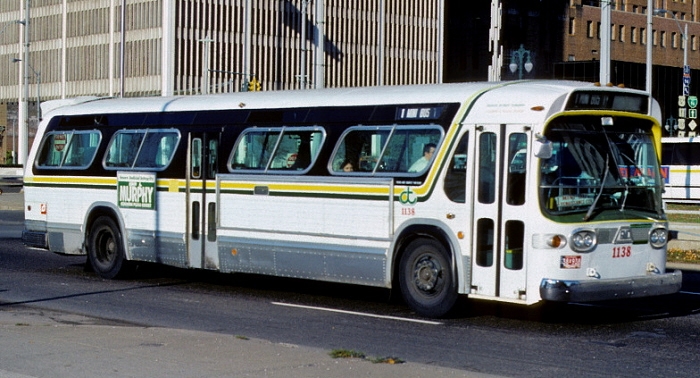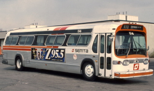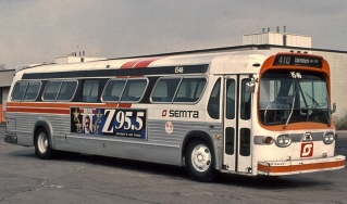 | DDOT's original, but short-lived, livery of white with black trimmed windows and green and yellow striping was introduced on the #1000-1100 series GMC "new-look" fleet that began arriving in June of 1975. Because the buses were purchased through the regional transit authority SEMTA, the SEMTA logo decal was displayed on the transmission door panel. (Melvin Bernero photobucket.com collection, used by permission of Melvin Bernero) |