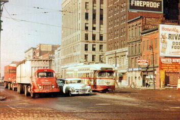 Between 1947 and 1956, a total of 186 PCC cars operated along the streets of Detroit. In 1947, the heavy Woodward line became the first DSR line to become 100% equipped with PCC cars. The Woodward PCCs would loop at the Detroit River via south on Woodward, west on Woodbridge, south on Griswold, east on Atwater, and then back to Woodward. In this 1953 photo, car #272 heads south along Griswold, preparing to turn onto Atwater Street. The cars would turn along-side the old Vernor's Ginger Ale bottling plant—a former downtown landmark. (Joe Testagrose Collection photo)