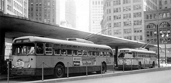 | Around 1955, the DSR opened its new redesigned bus shelter and waiting station in Capitol Park. This photo shows two Grand River trolley-coaches laying-over northbound on Shelby, north of State St. in Capitol Park. The two coaches can be seen sporting both the old and new DSR color schemes. [photo courtesy of Tom's Trolley Bus Pix-Detroit] |