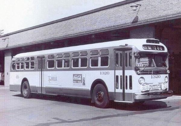 | Beginning in late October 1953, the DSR accepted delivery of its first twenty-five "high capacity" GM diesel buses - Model TDH-5105. Between November 1953, and the fall of 1957, a total of 355 of these air-suspension GM "old look" coaches (#1201-1555) were put into service. These 40-foot long, 51-passenger coaches were purchased primarily to replace the PCC streetcars on Jefferson, Michigan, Gratiot, and Woodward Avenues, but most of the small-size Fords, Transits, and Checker buses were also replaced. The first 130 (#1201-1330) arrived sporting the DSR's cream with red trim livery. The last of the TDH-5105's were retired in 1973. [photo courtesy of the Schramm Collection] |