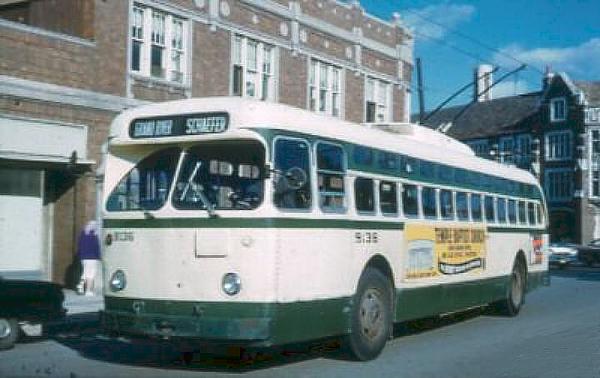 | Toward the end of their service lives a number of the St. Louis trolley-coaches were repainted in a new livery. Coach #9136 is seen here sporting the cream with green trimming color scheme, first introduced by the DSR on the GM "old-looks" delivered in 1956. [photo courtesy of Tom's Trolley Bus Pix-Detroit, MI] |
