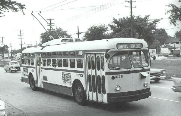 | In this photo, coach #9173 can be seen traveling eastbound on Grand River, between Seven and Six Mile Roads. Beginning on March 11, 1956, the trolley-coach service hours were reduced -- operating only during weekday daytime hours. Sadly, after only eleven years of service, Grand River trolley-coach service came to an end on Friday, November 16, 1962. The cars were never sold to other properties, and most were scrapped. |