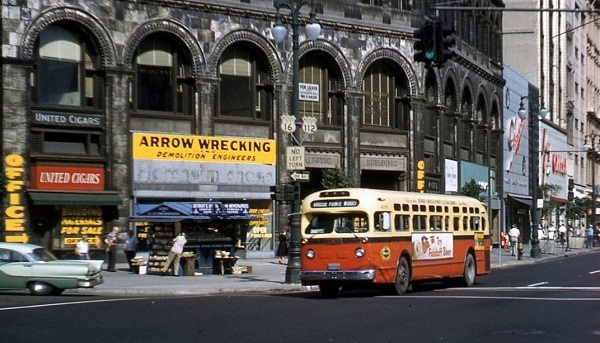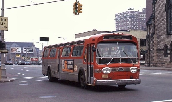 | Lake Shore would purchase additional fleets of the larger-size 40-foot x 102-inch New-Looks — all were second generation Model TDH-5303s. Six were purchased in 1963 (#511-516); one in 1964 (#517); three in 1965 (#518-520); and the last six (#521-526) in 1967. LSCL would order a total of 31 GM 'New-Look' coaches between 1959–1967. One of the #500-series TDH-5303s is seen here south along Woodward Ave at Adams while working the Charlevoix line. [photo courtesy of the Scott Richards photo collection – used with permission] |