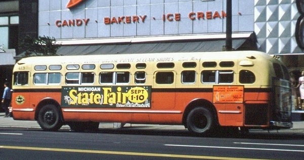 | Coach #413 (Model TDH-4512) was one of six coaches (#413–418) delivered in May 1959, one month before "Old Look" production was discontinued at GM Truck & Coach. By 1959, a total of 67 GM 'Old-Look' coaches (including 17 gasoline powered) were purchased by LSCL. Coach #413 is southbound along Woodward Ave just south of State Street in this August 1961 photo. [photo courtesy of the Scott Richards photo collection – used with permission] |