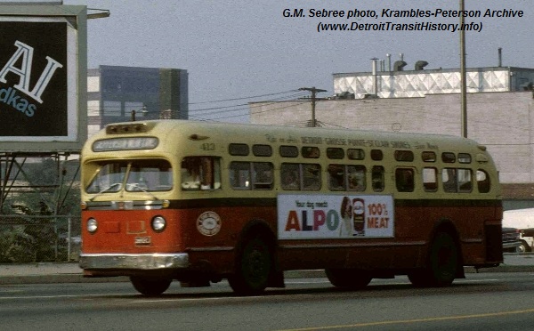 | Again we see coach #413 in this August 1969 photo while eastbound along E. Jefferson at the Dequindre Cut railroad overpass while working the Jefferson Beach line. The caption written across the top of LSCL 'Old-Looks' read, "Ride on Air... DETROIT∙GROSSE POINTE∙ST. CLAIR SHORES ...Save Money." Coach still on roster when purchased by SEMTA in 1971. [photo courtesy of the Krambles-Peterson archive collection: G. Mac Sebree photo] |