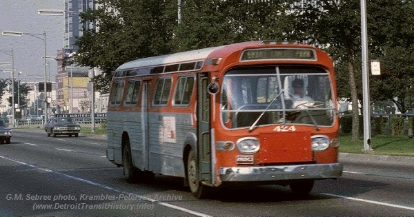 | Coach #424 (Model TDH-4517) was one of the first six GM 'New-Look' coaches (#419-424) delivered to Lake Shore Coach Lines in January of 1960. Coach #424 is seen here in this 1969 photo while eastbound on E. Jefferson just east of Woodward in downtown Detroit. This coach was still on the roster when Lake Shore Coach Lines was taken-over by SEMTA on Sept. 1, 1971. [photo courtesy of the Krambles-Peterson archive collection: G. Mac Sebree photo] |