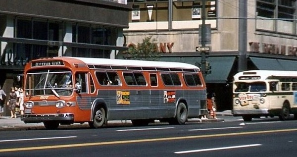 | Lake Shore would also purchase nine of the larger 40-foot Model TDH-5301s to replace the eight 'Old-Looks' (#501-508) that were sold to St. Louis Public Service in 1959. The nine buses were delivered in January and June 1960, and numbered #501-508 (same as 5105s) and #510. In this 1961 photo, coach #507 is south along Woodward at Clifford working Jefferson Beach. [photo courtesy of the Scott Richards photo collection – used with permission] |