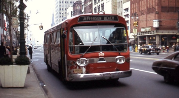 | All three Lake Shore routes utilized Jefferson Ave into downtown Detroit, then via Woodward; looping via Elizabeth, Witherell, and Columbia to Grand Circus Park. Coach #519 was one of three 5303s (#518-520) delivered in October 1965, and is pictured here south along Woodward at Grand River. Most of the New-Looks were still on the roster when SEMTA took over in 1971. [photo courtesy of the Scott Richards photo collection – used with permission] |