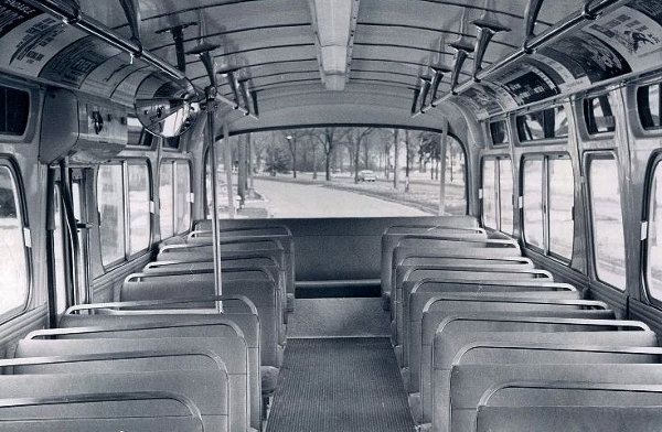 | This Jan. 28, 1960 photo shows the rear interior view of one of LSCL's first GM 'New-Look' coaches. The TDH-4517 model seated 45 passengers and was 35 feet long and 96 inches wide. Unlike the Detroit DSR 'New-Looks' delivered around that same time, the Lake Shore fleet arrived with the "push-type" rear door feature — made standard on the GM 'New-Look' buses. [photo source: online – unknown (unidentified) photo collection] |